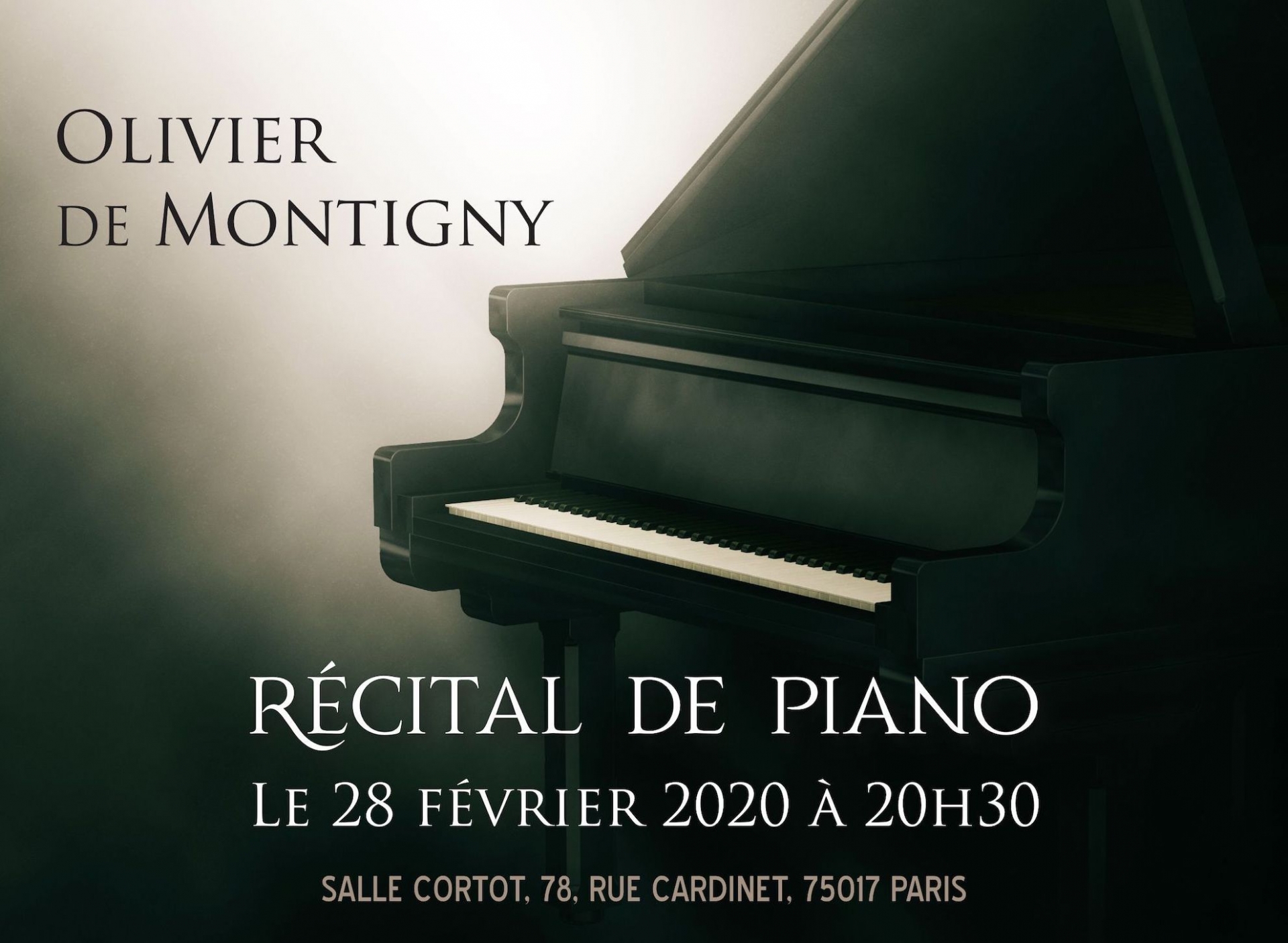 Olivier de Montigny donne depuis une trentaine d’années un à deux récitals par an, à Paris ou en province, au profit d’œuvres humanitaires telles que l’Arche, la Fondation Jérôme Lejeune ou la Société Saint-Vincent de Paul. Pour la rentrée 2020, Olivier de Montigny a choisi d’offrir un concert dont les bénéfices seront reversés au Cours Saints-Martin (Sablé-sur-Sarthe).